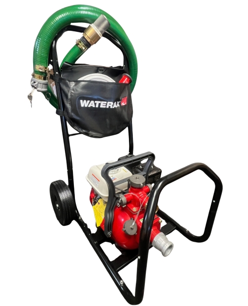 High Pressure 2 Stage Gas Powered Fire Pump specifically designed for home fire fighting or irrigation, 50 feet of fire hose, nozzle, 12 ft. of PVC Suction Hose with foot valve, all fittings & hose adapters already assembled on stand up cart with wheel kit. NO TAX. FREE SHIPPING IN 1-2 DAYS.