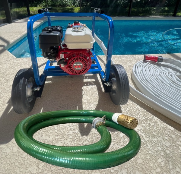 WINTER SPECIAL: Protect your home and property from a wildfire using your swimming pool water. Package includes a Portable Pool Fire Pump Cart on wheels with a 6.5 HP gas fire pump, 100 feet of high quality single jacket fire hose, nozzle, 12 ft. of PVC Suction Hose with foot valve, all fittings & hose adapters already assembled. NO TAX. FREE SHIPPING IN 1-2 DAYS.